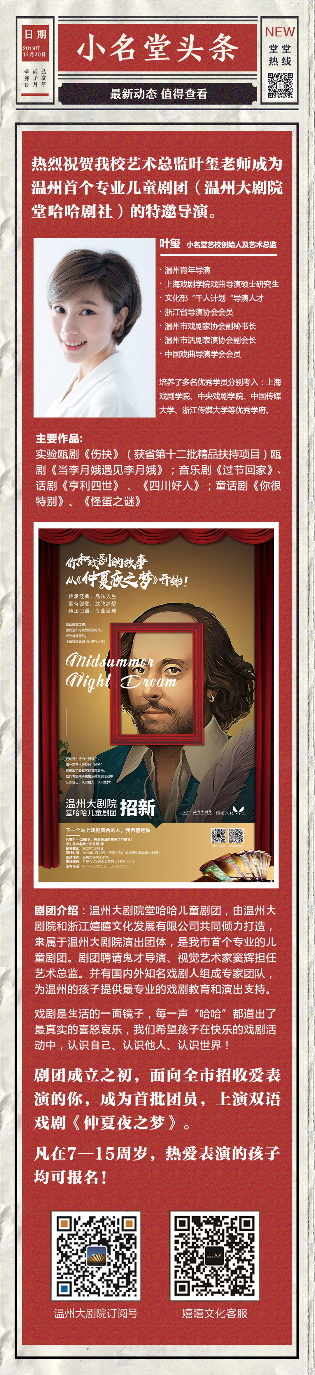 小名堂头条叶玺老师成为温州大剧院堂哈哈剧社特邀导演
